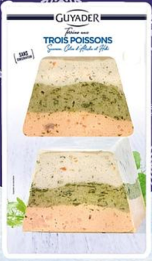 Autre exemple avec une terrine Guyader « aux trois poissons : saumon, colin d’Alaska et hoki ». C’est naturellement ce que le consommateur s’attend à retrouver majoritairement dans la liste des ingrédients. Or, à la lecture de l’étiquetage, plusieurs éléments interpellent :